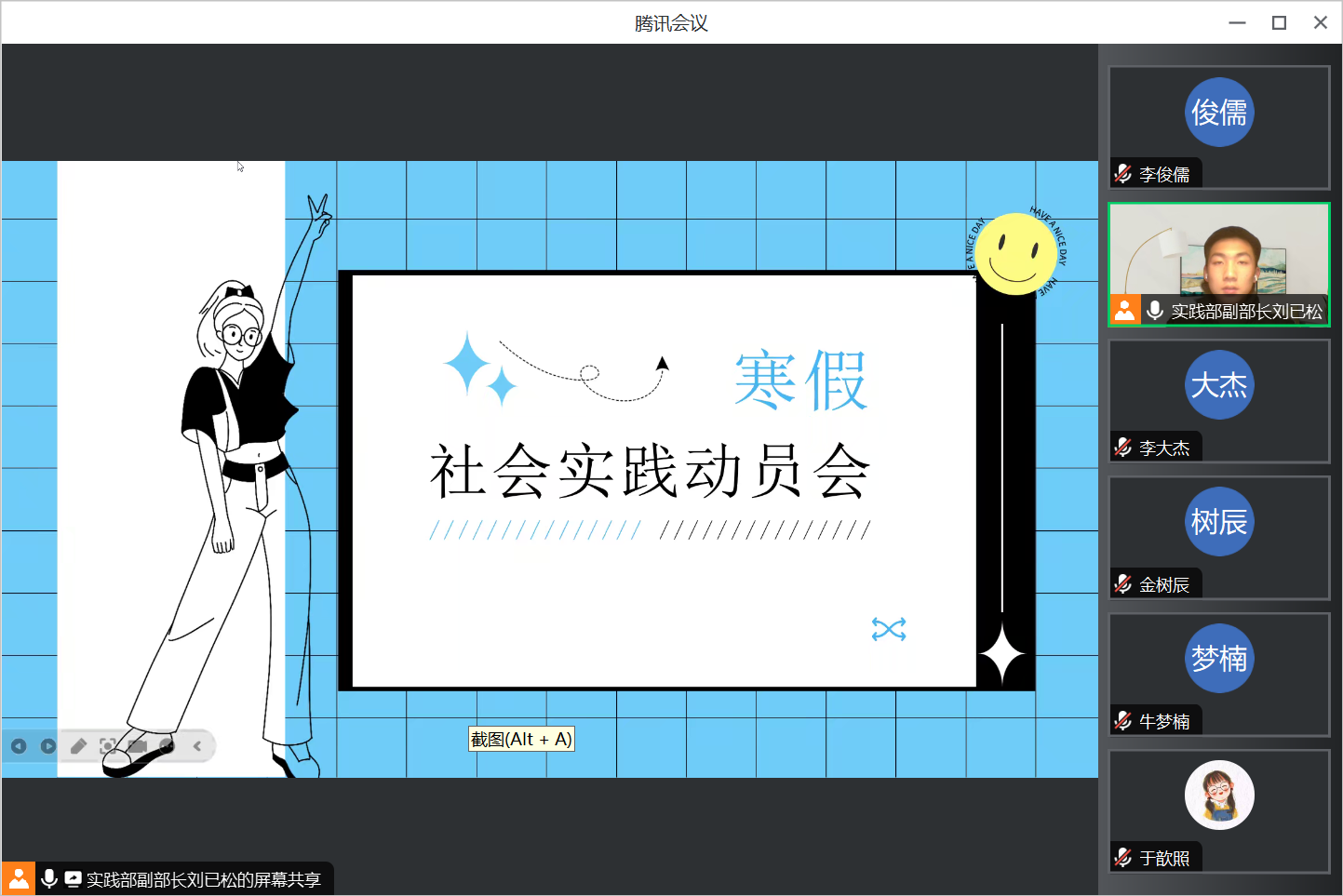 团委于2023年1月12日以线上的形式开展了2024年寒假社会实践活动动员会,主题是“汇聚青春力量,激励挺膺担当”。会议由团委实践部副部长刘已松主持,分三部分展开。