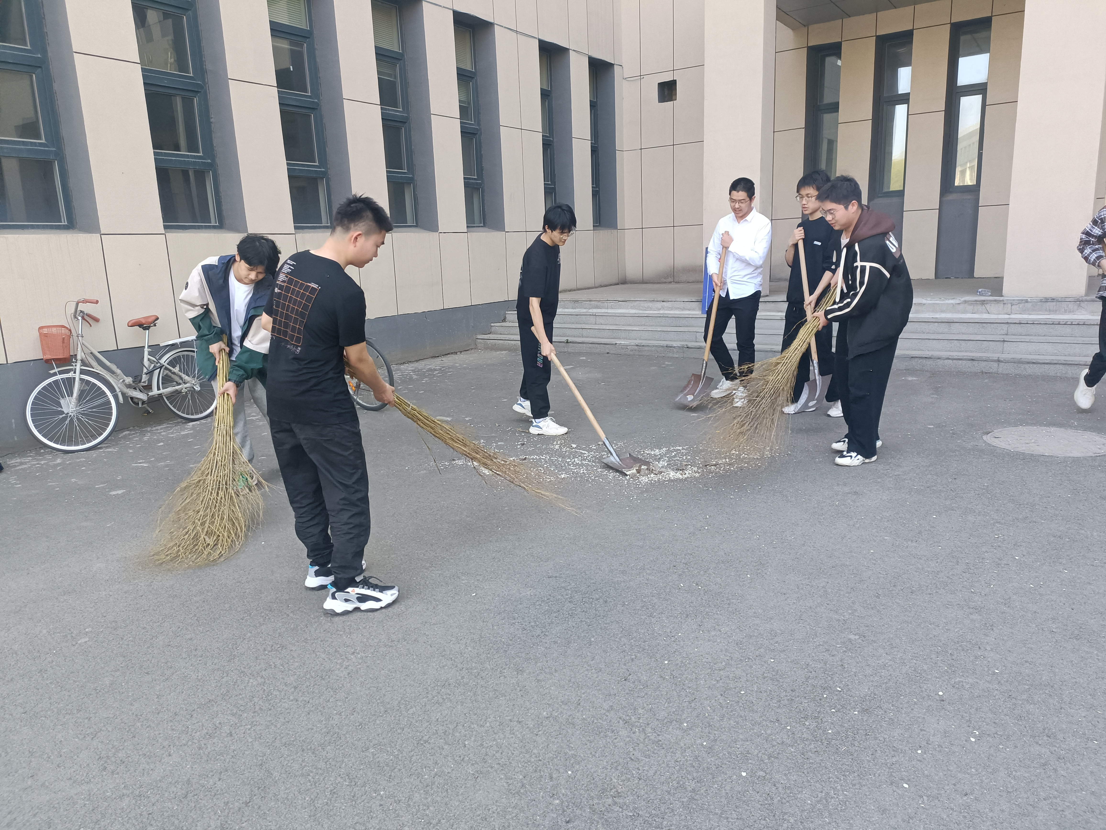 的学生志愿者们手拿铁锹、扫帚、垃圾袋等清扫工具来到计算机楼西门进行垃圾清扫活动。“扫清垃圾,共创美丽吉大!”本次活动以志愿者们的一声又一声响亮激昂的口号拉开帷幕。在五月充沛的阳光照射下,志愿者精神抖擞,个个磨拳擦手,想要为校园的美化贡献自己的力量。在清扫中,志愿者们紧密配合,自发地组成小组,有条不紊地进行清扫工作。他们捡起一片片碍眼的垃圾,扫去一簇簇挡路的落叶,擦去一丝丝脏污的灰尘。他们齐心协力,分工明确,有的提着垃圾袋,有的摆着自行车。随着志愿活动的进行,校园也恢复了它原有的美丽清洁。当同学们看着与自己日夜相伴的校园在自己的双手下变得一尘不染,纷纷露出了满足的笑容。同学们用自己的汗水对计算机楼西门做到了全面清理,把每一个卫生死角都清理得干干净净,真正做到了做到清理一处,靓丽一处。
