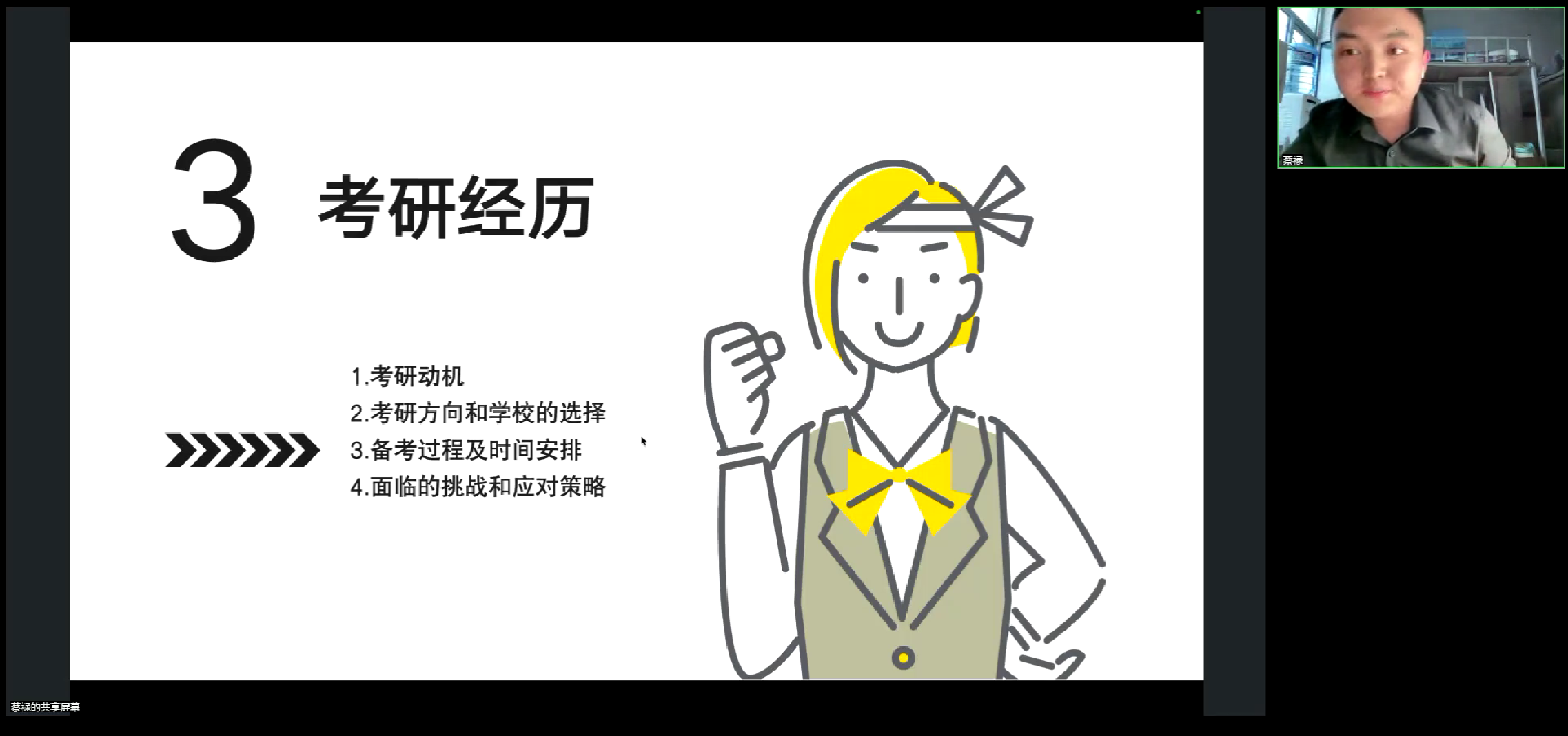 分享会伊始,主讲人向大家详细介绍了自己的个人基本情况及学习、工作经历,包括大三下学期的备考经历、辅修金融学位、担任社团职务等,与同学分享了自己备考金融科技专业的心路历程。他表示,放弃考研、走向就业的这一决定并不意味着失败,而是基于对自己职业理想的更清晰认识,考研并不仅仅是一种学术追求,而是面向个人发展目标的道路选择。他建议学弟学妹们在选择是否考研时,应该结合个人兴趣和未来成长路线进行合理决策。