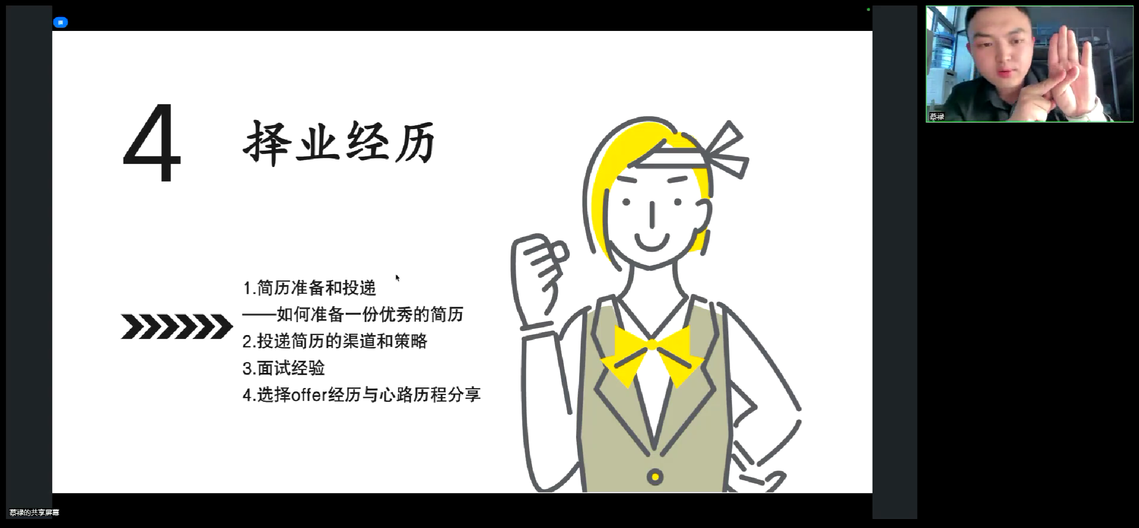 随后,主讲人与同学们分享了自己的求职经历,强调获得好工作的关键在于明确自己的目标和定位、做好充分的准备以及全面地展示自己。他从简历制作的角度切入,提醒同学们要在简历中突出个人技能和项目经验,避免简历内容冗长和杂乱。在此基础上,主讲人介绍了一系列高效的简历投递策略,建议同学们优先选择官网渠道进行简历投递,同时积极寻找并利用好内推资源。在面试技巧方面,他鼓励大家在面试中保持自信和乐观的态度,做到临场不乱、从容应对。此外,主讲人还以自己和身边同学的经验为例,强调了实习工作经历的重要性,呼吁同学们把握好实习机会,争取早日转正,实现职业发展目标。在互动提问环节,主讲人耐心回答了同学们关于考研准备、简历优化、面试技巧等方面的问题,为学弟学妹们提供了有益的经验指导和切实可行的建议。