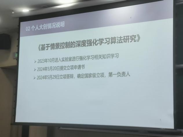 分享会邀请2022级卓越工程师班陈赓担任主讲人,2023年他以项目第一负责人的身份成功确定国家级立项《基于情景控制的深度强化学习算法研究》。